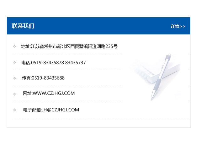 地址:常州市新北區友邦商務大廈1幢16、17層  電話:0519-85101652  傳真:0519-85112595  郵編:213022  網址:www_cz-jiayue_cn.hsjqly.com  郵箱:xiajifengaa@163.com